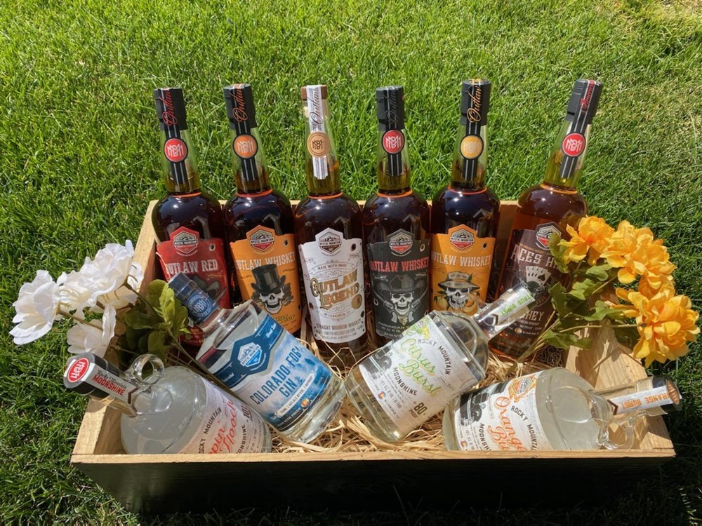 Mystic Mountain Distillery basket including 10 different items including moonshine, bourbon, whiskey and gin. Retail value $300.